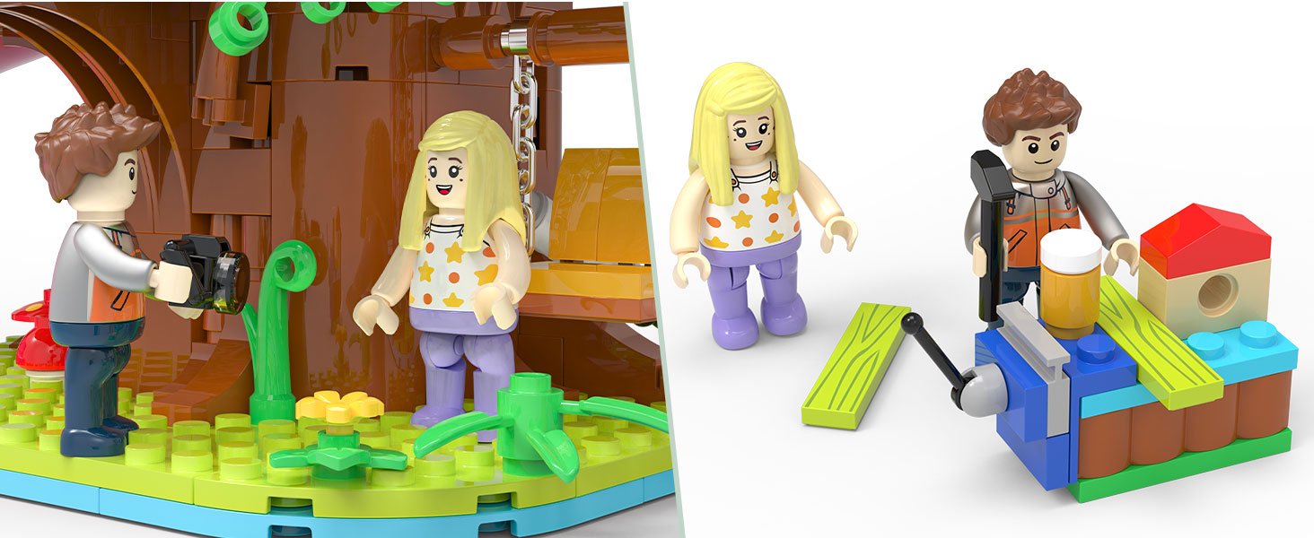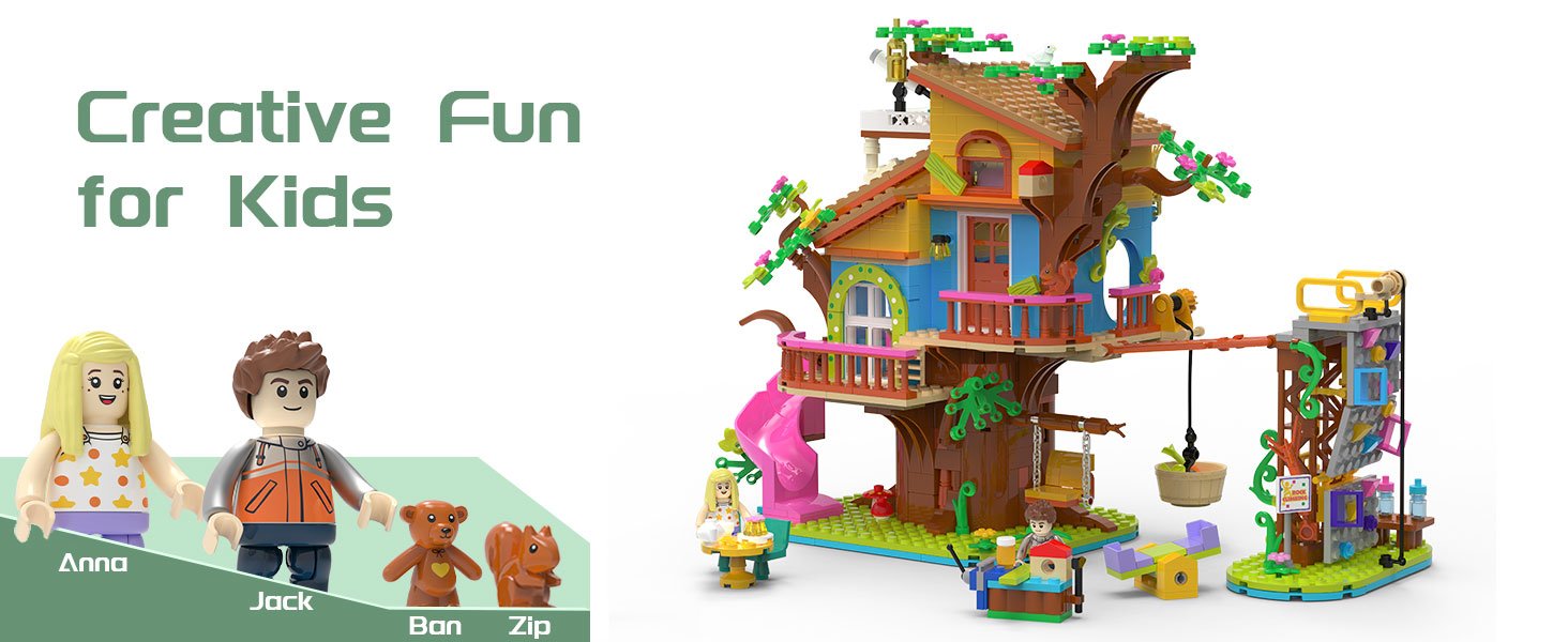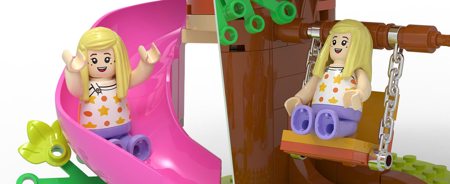 • This tree house set unlocks endless imaginative play! With multiple play areas including a pink slide, tree swing, climbing wall, and cozy tea nook, kids can create their own adventures. The included 2 minidolls (Anna & Jack) and adorable animal friends (teddy bear Ban & squirrel Zip) bring the scene to life, letting kids act out stories for hours on end